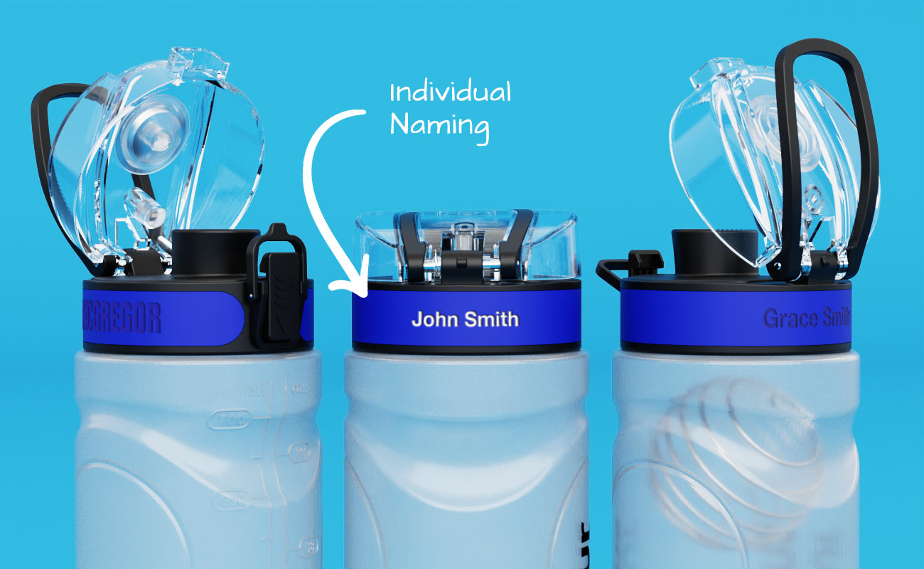 The engraving creates a completely indelible form of name marking. It's perfect for sports clubs and schools, avoiding any potential mix-ups of Water Bottles or Travel Cups during training or competition. Each unique name will accompany your logo and slogan on the Drinkware product.