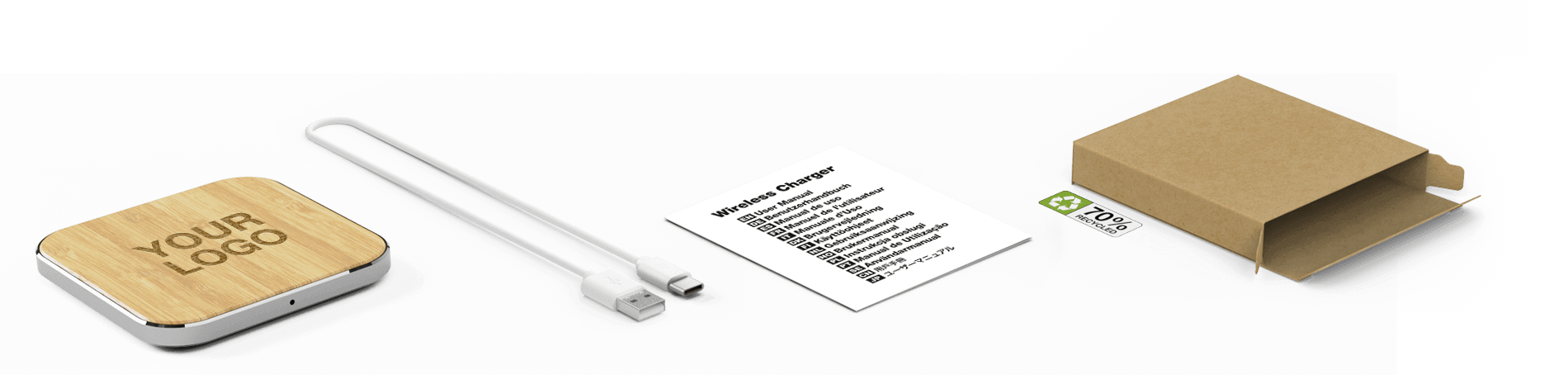 The charger features a USB-C power cable for reliable connectivity and is compatible with all Qi-enabled devices, including smartphones and tablets, ensuring your clients and staff stay powered up throughout the day.